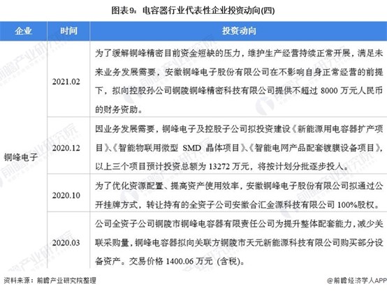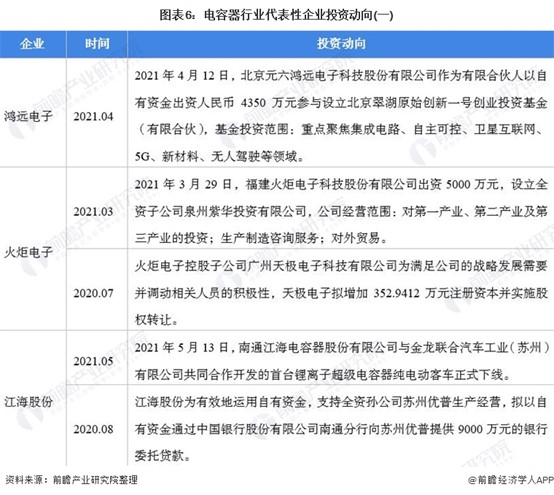 2020年以来,电容器行业代表性企业的投资动向主要包括收购公司拓展业务、通过对子公司增资的方式投资电容器生产基地项目。电容器行业代表性企业最新投资动向如下: