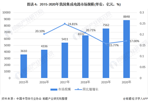 图表4:2015-2020年我国集成电路市场规模(单位:亿元,%)