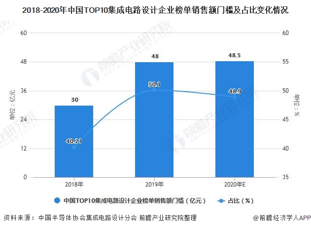 根据中国半导体Milan.com集成电路设计分会2019年11月公布的《2019年中国十大芯片设计厂商(未统计港澳台地区)的营收数据预测报告》显示,2019年中国前十大集成电路设计企业的总销售约1558.0亿元,占全行业产业规模比例的50.1%,而2018年同期为40.21%。