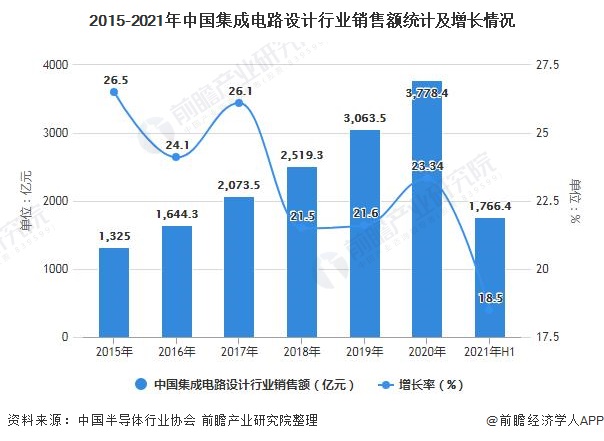 2021年上半年,中国集成电路产业销售额达到4102.9亿元,同比增长15.9%。其中,设计业销售额达到1766.4亿元,同比增长18.5%。