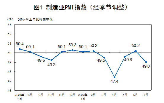 7月份,制造业采购经理指数(PMI)为49.0%,比上月下降1.2个百分点,位于临界点以下,制造业景气水平有所回落。