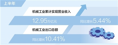 外贸出口稳步增长。上半年,机械工业累计实现进出口总额5113.6亿美元,同比增长3.99%。其中出口总额3441.2亿美元,同比增长10.41%。汽车、工程机械等产品表现突出,上半年汽车整车出口超过120万台,同比增长41.4%。